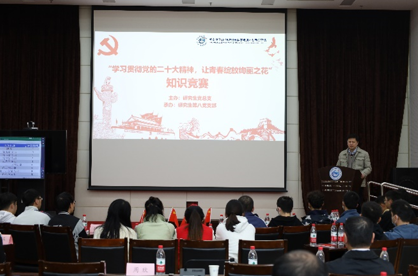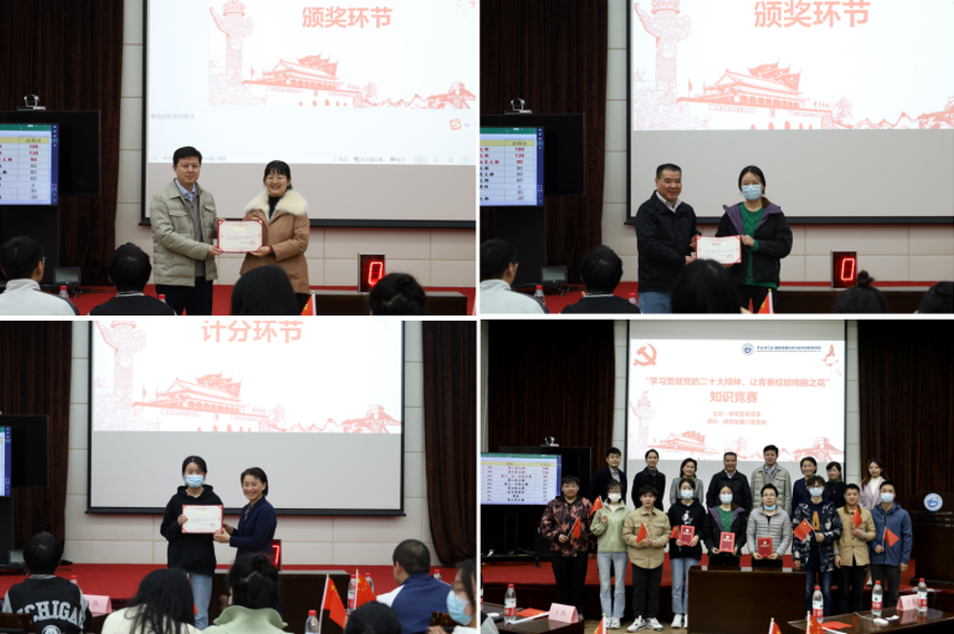本次比赛的题目以二十大报告、新党章为主,穿插了近十年来重大的科技开展事件,顺利获得填空、选择、简答、看图说事等题型,带领大家学习大会精神、深化思想认识、感受科技巨变。经过“必答题”、“抢答题”等环节的精彩比拼,研究生第八团支部代表队、研究生第六团支部代表队和研究生第一、二、五团支部联合代表队分获冠、亚、季军。