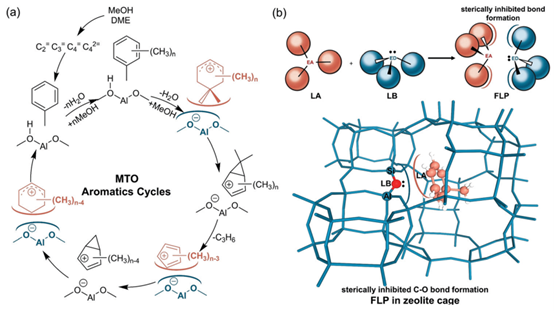 图:(a)分子筛限域孔道中芳香性碳正离子参与的甲醇转化机理;(b)分子筛限域孔道中芳香性碳正离子与骨架形成的FLP结构
