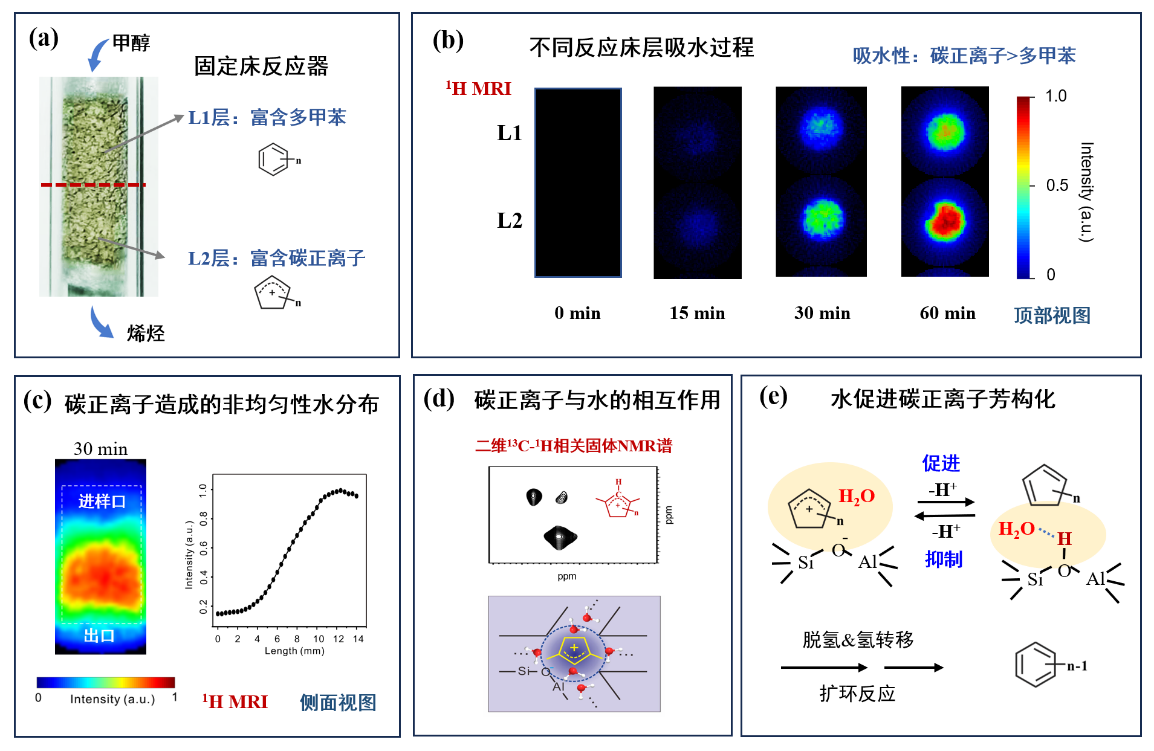 (a)“烃池”物种在MTO反应器中的非均匀分布;(b)利用1H MRI技术研究不同反应床层的吸水过程;(c)水在反应器中非均匀分布的1H MRI图谱;(d)二维13C-1H相关NMR谱研究碳正离子与水分子的相互作用;(e)水促进环戊烯碳正离子芳构化机制