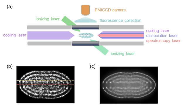 此外,在双组份离子晶体中,HD+离子呈现为不发荧光的”暗离子”,共振解离时HD+离子数量的变化是光谱测量的关键。研究团队提出空间分辨的荧光收集技术,利用高灵敏度电子倍增增强型CCD相机(EMICCD)对离子晶体图像进行实时采集,实现HD+离子数量的非破坏性、实时测量(图1)。