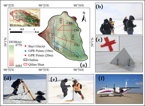 a为八一冰川位置及GPR测量路线,图b-e为地面测量,图f为新舟60遥感飞机