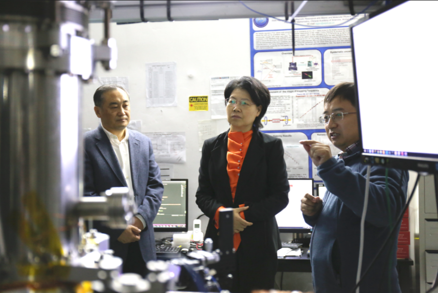肖菊华重点考察了重大科技创新平台和基础设施建设情况,在精密测量科学与技术创新研究院,考察了星载铷钟实验室、钙离子光钟实验室、十米原子喷泉实验室、磁共振实验平台、人体肺部磁共振成像实验室,梅刚华研究员、柳晓军、周欣副院长分别作了详尽的介绍。肖菊华与科技工作者深入研讨,询问科研成果取得的关键突破和应用转化带来的实际效益,对他们科学报国的坚定信念和勇攀高峰的科学精神表示钦佩,勉励他们继续面向世界科技前沿、面向经济主战场、面向国家和湖北开展重大需求,产出更多科研成果,服务国家战略需求和地方经济社会开展。